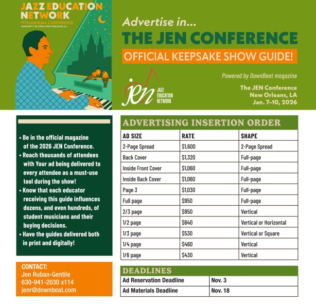 - Reach thousands of attendees with your ad in the JEN Conference Official Keepsake Show Guide, published by DownBeat Magazine!